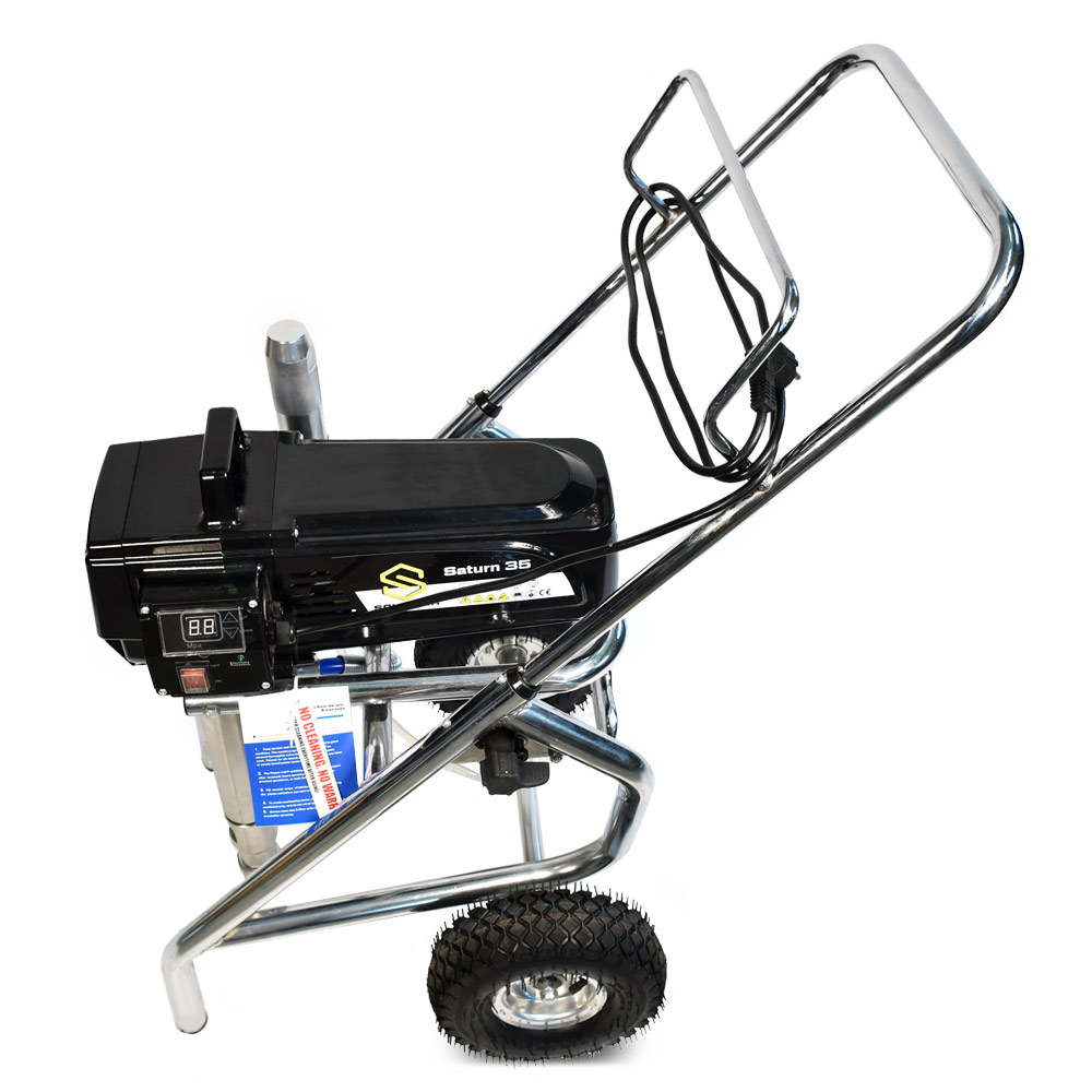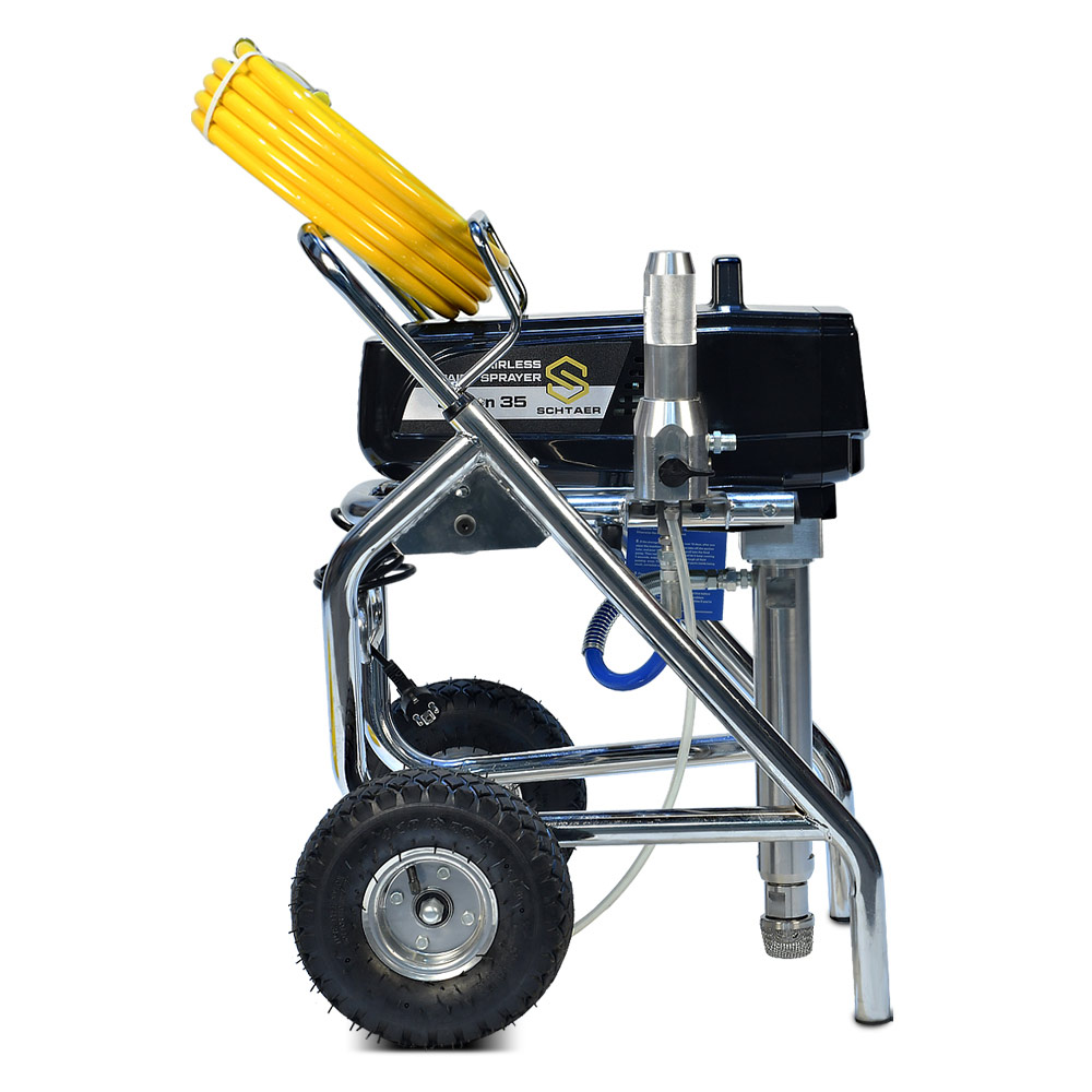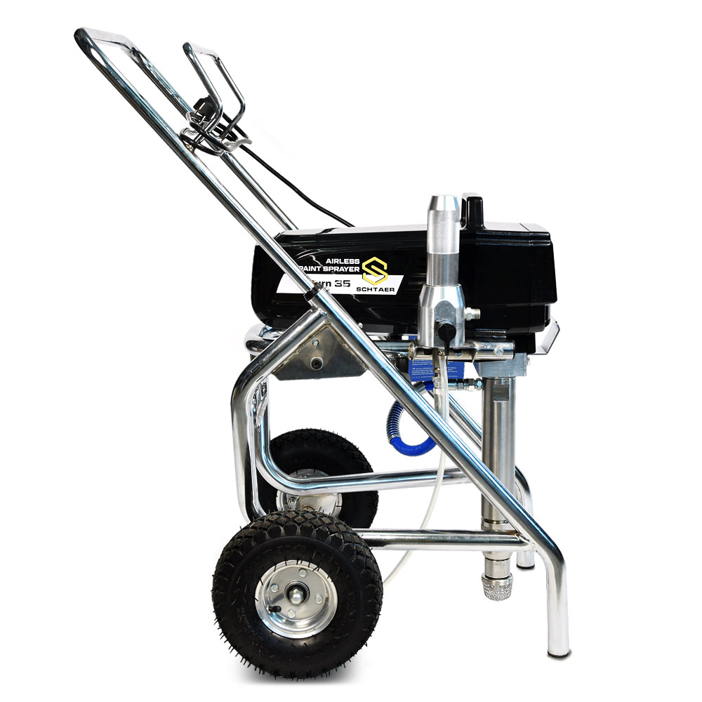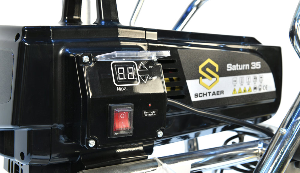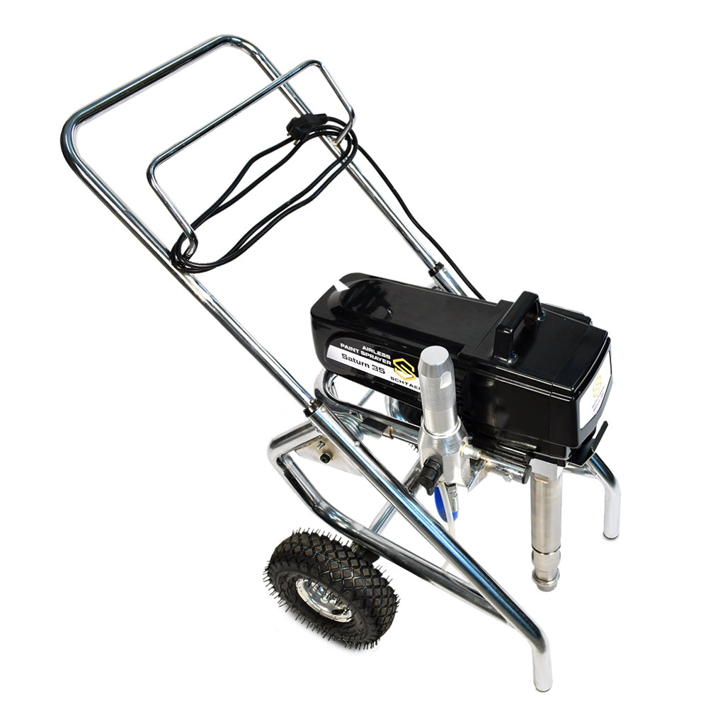 Schtaer Saturn 35 - оборудование для окраски под высоким давлением через окрасочный краскопульт безвоздушного распыления. Окрасочный агрегат безвоздушного распыления предназначен для использования на строительных площадках и промышленных предприятиях. Он применяется для распыления под большим давлением красок средней и высокой вязкости. таких как: огнезащитные краски, фасадные краски, водоэмульсионки, латексные и акриловые краски, грунтовки и эмали по металлу, эпоксидные материала, однокомпонентные краски и двухкомпонентные составы с большим временем жизни, краски и лаки по дереву. Окрасочный аппарат используют для покраски вязкими красками через один окрасочный пистолет, при распылении лакокрасочных материалов средней вязкости аппарат возможно использовать на два краскопульта. Окрасочный аппарат засасывает краску через специальный прямой заборник с фильтром с помощью поршневого электрического насоса. На выходе из насоса краска также фильтруется перед подачей на безвоздушный краскопульт.